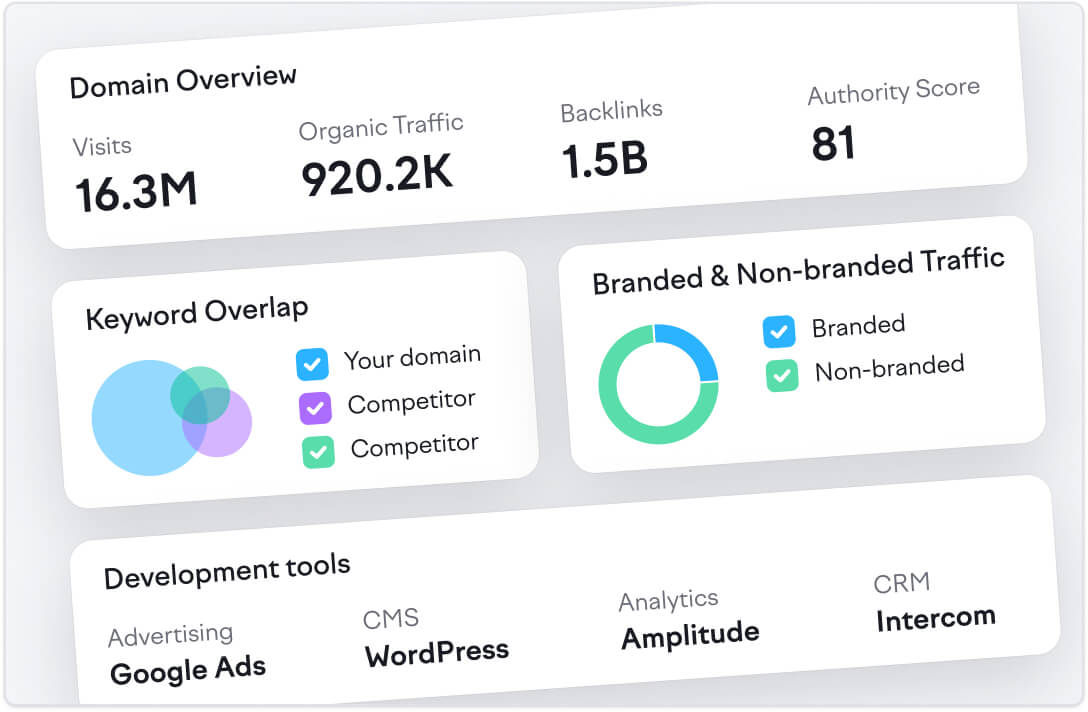 • Locate growth opportunities and gaps in online visibility in no time with Semrush’s robust data.